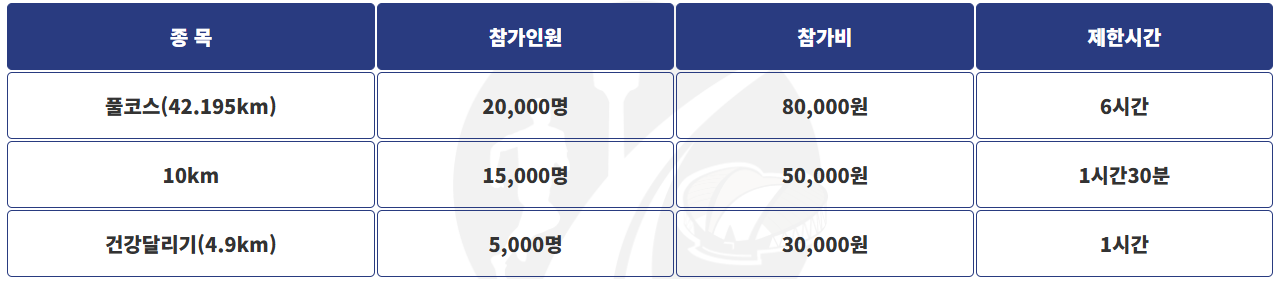 | 풀코스 마라톤 | 42.195km | 80,000원 | 20,000명 | 6시간 | 만 18세 이상 |