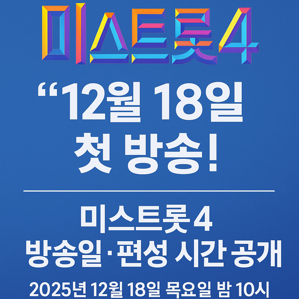미스트롯4 방송일이 드디어 확정됐습니다. TV조선 ‘미스트롯4’는 2025년 12월 18일(목) 첫 방송을 시작으로 매주 목요일 밤 10시~금요일 새벽 1시까지 3시간 편성으로 방영됩니다. 시즌3보다 강화된 지역 예선, 마스터 군단 개편, 참가자 규모 확대, 글로벌 참가자 가능성 등 시즌4만의 업그레이드 포인트를 한 번에 정리했습니다. 첫 방송일, 편성 시간, 기본 정보, 시즌4 관전 포인트까지 이 글 하나면 미스트롯4 정보 준비 끝입니다.