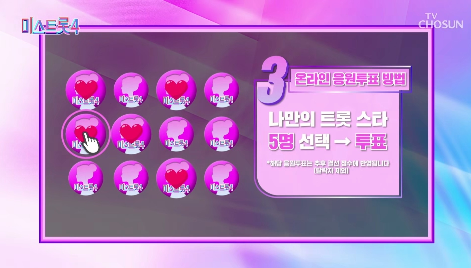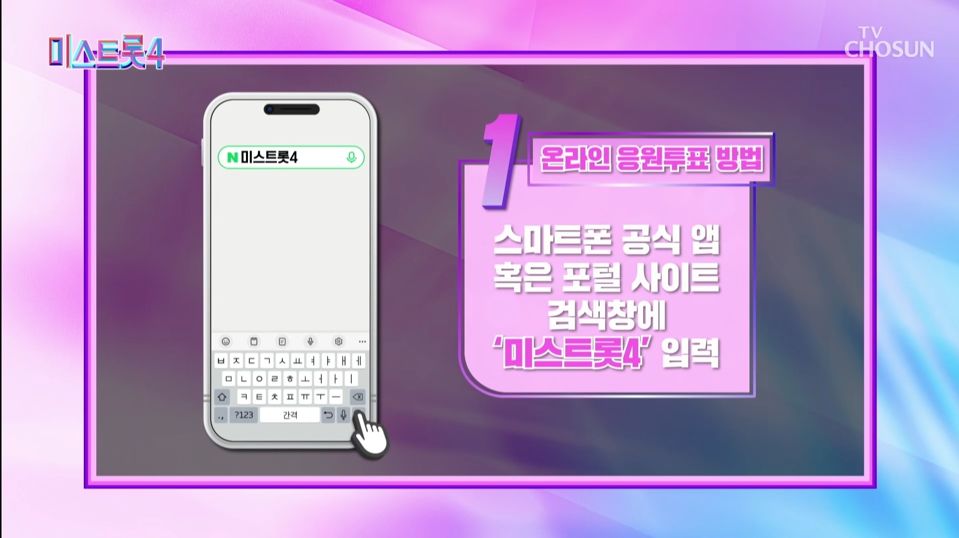 📌 스마트폰 공식 앱 또는 포털 사이트 검색창에서 '미스트롯4' 입력 하세요. - '대국민 응원 투표' 버튼 클릭