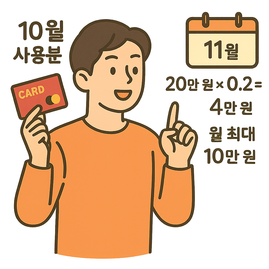 단, 월 최대 10만 원 한도가 있어서 아무리 많이 써도 초과분은 지급되지 않아요.