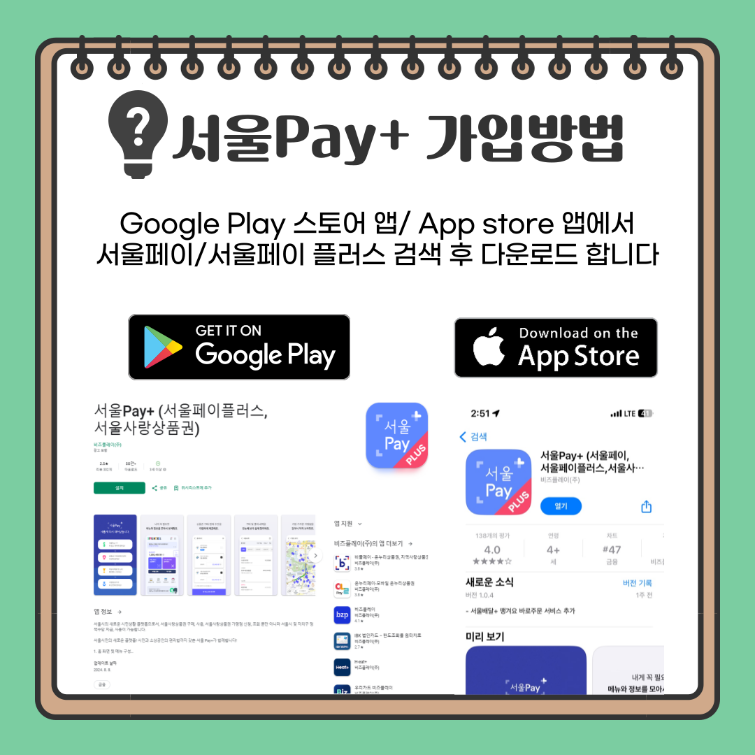 - 아이폰(Apple): [앱스토어] 접속 → '서울페이+' 또는 '서울Pay+' 검색 → 받기