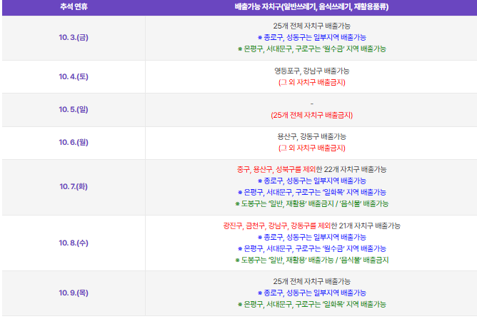 | 10월 3일(금) 19시~24시 | ✅ 전 지역 배출 가능 | 연휴 전 마지막 정상 수거 |