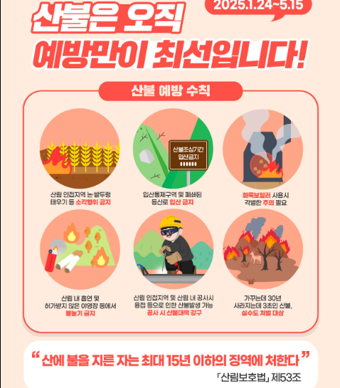 2. 입산 통제 준수: 산불 위험이 높은 시기에는 산림청에서 입산 통제를 실시합니다. 이를 반드시 준수하여야 합니다.