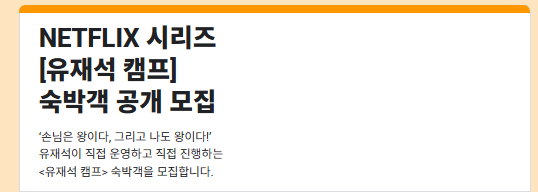 넷플릭스 예능 유재석 캠프 숙박객 모집 신청 방법을 정리했습니다. 참가 조건, 신청 링크, 자기소개 작성 팁까지 한눈에 확인하고 특별한 민박 체험에 도전하세요.
