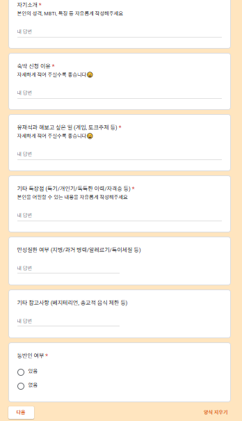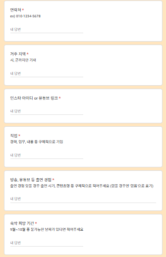 방송 또는 유튜브 출연 경험 여부와 희망 숙박 기간 입력