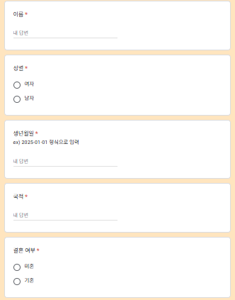 이름, 성별, 생년월일, 국적, 결혼 여부, 연락처, 거주 지역 등