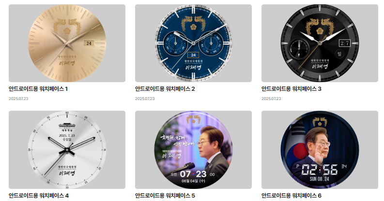 이들은 시계 페이스로 사용 가능하며, 각 디자인에는 대통령 휘장, 서명, 자필 메시지 등 이재명 대통령을 상징하는 시각적 요소가 포함되어 있다.