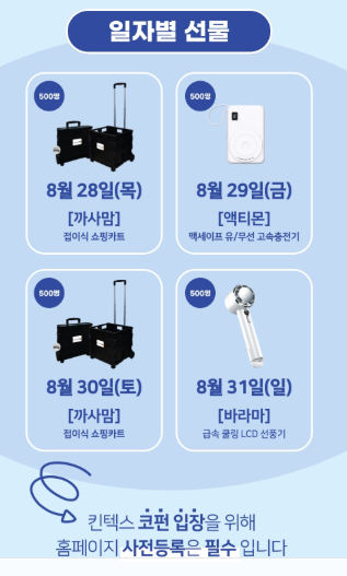 사전등록 후 방문하면 매일 선착순 500명, 총 2,000명에게 다양한 사은품을 증정합니다.
