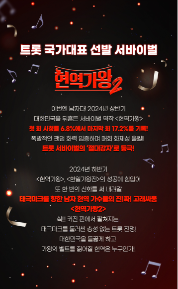 2024년 음악계에서 화제를 모은 프로그램, "현역 가왕 2"가 다시 돌아왔습니다. 첫 번째 시즌에서 독보적인 음악성과 감동적인 무대를 선보이며 대중의 큰 사랑을 받았던 "현역 가왕"은, 이번 시즌을 통해 한층 더 발전된 모습으로 대중을 찾아왔습니다. 이 프로그램은 현역으로 활동 중인 실력파 가수들이 정체를 숨긴 채 다양한 장르의 음악에 도전하며 가창력을 겨루는 신개념 음악 경연 프로그램입니다.