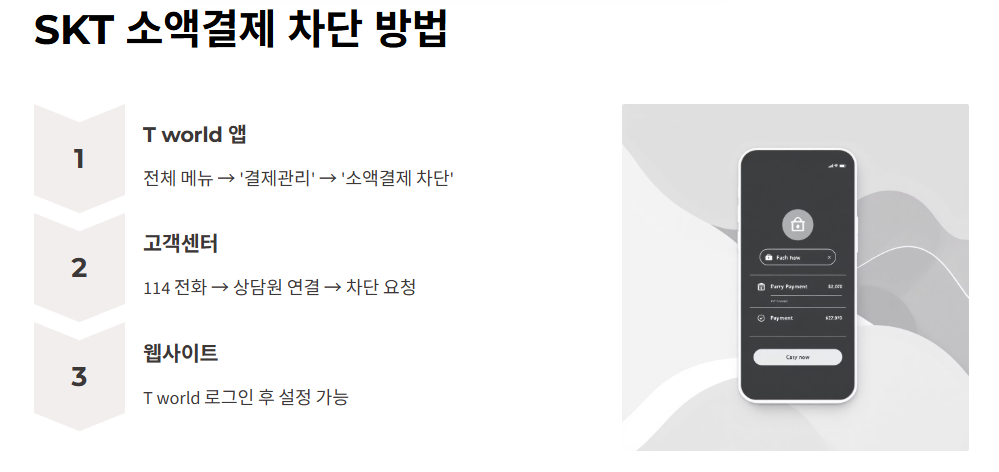 - T world 앱 → 전체 메뉴 → '결제관리' → '소액결제 차단'
