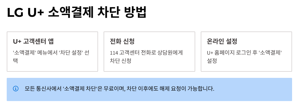 TIP: 모든 통신사에서 '소액결제 차단'은 무료이며, 차단 이후에도 해제 요청이 가능합니다.