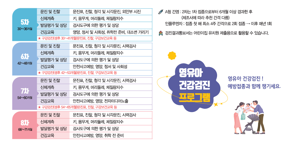 검진은 아동의 성장 발달 주기에 따라 다음과 같이 8차례에 걸쳐 실시됩니다.