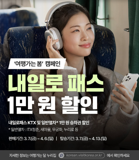 국내 여행의 계절, 봄이 돌아왔습니다. 문화체육관광부와 한국관광공사가 함께하는 ‘여행가는 봄’ 캠페인이 2025년 봄, 전국 곳곳의 여행객들에게 풍성한 혜택을 선사합니다. 그중에서도 여행 마니아들의 마음을 가장 설레게 하는 소식은 바로 ‘내일로 패스 1만 원 할인’ 소식입니다. 특히 KTX와 ITX청춘, 새마을, 무궁화호 등 일반 열차를 포함한 광역 철도까지 할인 적용이 가능하다는 점에서 이번 봄, 기차여행을 고려하는 분들에게 더없이 좋은 기회가 될 것입니다.