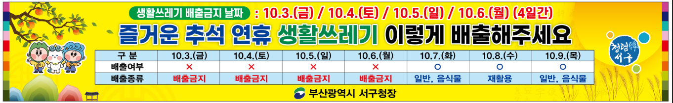 부산 서구는 배출금지 날짜 10/3(금)~10/6(월), 4일간 중단되며 7일(화)부터 일반,음식물쓰레기 배출이 재개됩니다.