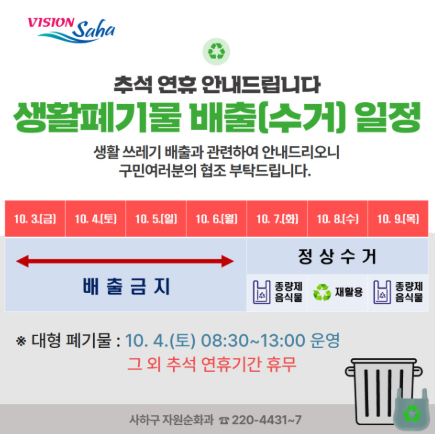 부산 사하구는 10월 3일(금)~6일(월)까지 수거 중단, 7일(화)부터 정상수거 가능합니다. 단, 재활용품은 8일(수) 가능합니다.