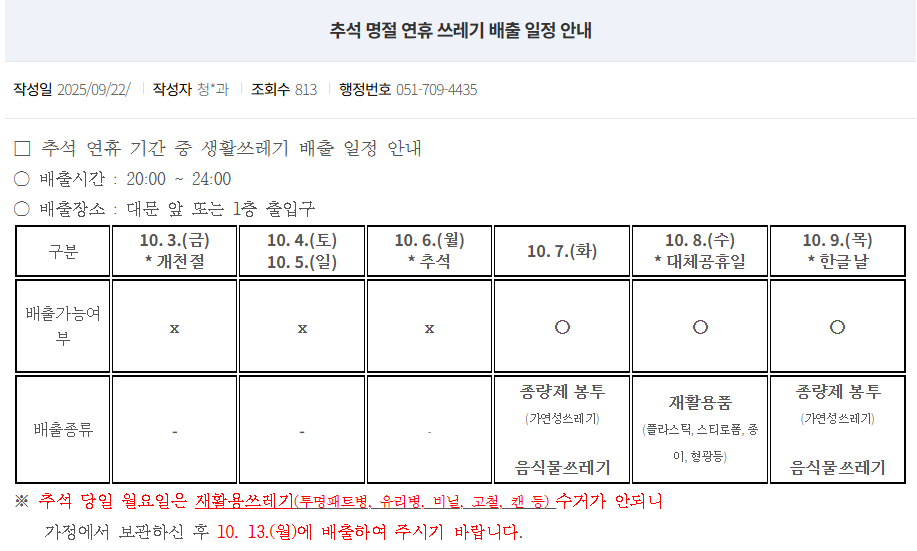 부산 동래구 추석당일부터 요일별 배출 품목에 맞게 배출 가능