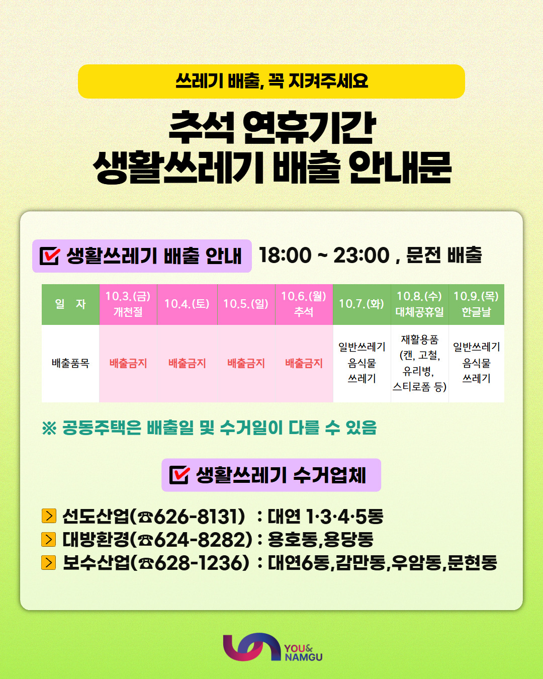 부산 남구는 10월 3일(금)~6일(월)까지 수거 중단, 7일(화)부터 재개됩니다. 재활용품은 8일(수) 가능합니다.