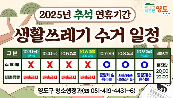 부산 영도구는 10월 3일(금)~6일(월)까지 수거 중단, 7일(화)부터 재개됩니다. 재활용품은 8일(수) 가능합니다.