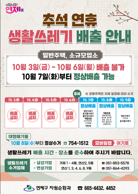부산 연제구는 10월 3일(금)~6일(월)추석 까지 수거 중단, 7일(화)부터 재개됩니다. 대형폐기물은 8일(수)부터 정상수거 가능합니다.