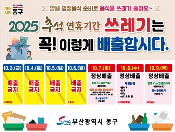 부산 동구, 추석 당일까지 중단. 7일부터 일반쓰레기 음식물쓰레기 가능