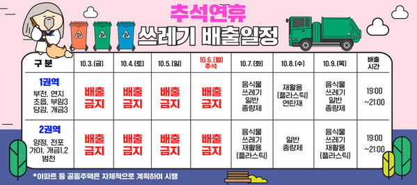 부산 수영구는 추석 당일과 전날(10월 5일~6일)에는 생활쓰레기 수거가 이루어지지 않습니다.