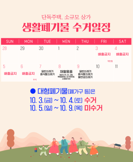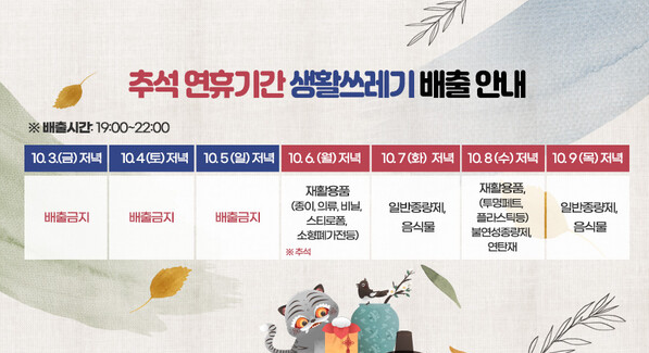 대신 10월 7일(화)부터는 일반쓰레기, 음식물 쓰레기 정상 운영되며, 재활용품 수거는 10/8일(수) 재개됩니다.