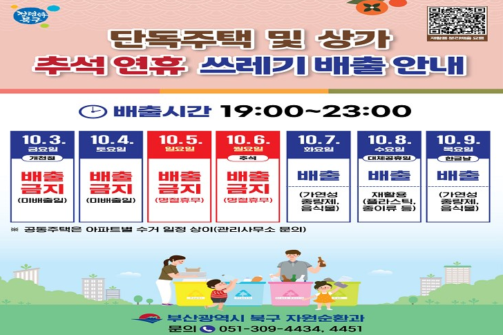 부산 북구는 10월 3일(금)~6일(월)까지 수거 중단, 7일(화)부터 재개됩니다. 단, 재활용품은 8일(수) 가능합니다.