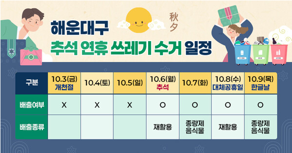 부산 해운대구는 추석 연휴 중 10월 6일(월)부터는 재활용 배출이 가능하며, 생활쓰레기, 음식물쓰레기 수거하지 않으니 참고해주세요.
