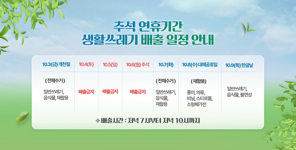 대신 10월 7일(화)부터는 정상 운영되며, 재활용품 수거도 이 시점부터 재개됩니다.