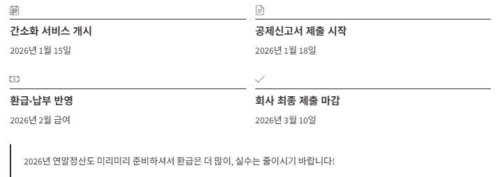 | 2026.1.18~ | '편리한 연말정산 서비스' 이용 가능, 공제신고서 작성 시작 |