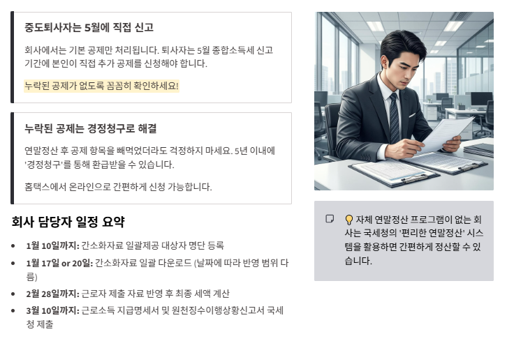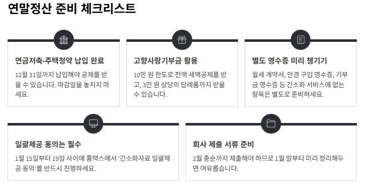 | ~2025.12.31 | 공제 항목 납입 마감 (연금저축, 청약저축, 기부금 등) |